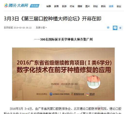 腾讯网在全国各地报道:“3月3日《第三届口腔种植大师论坛》开幕在即”